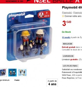 Jusqu’au 18 novembre, la fnac propose la livraison gratuite à domicile sans minimum .. Et cela peut etre très interessant si on a besoin d’un petit jouet pas cher .. Par exemple on peut voir à 3.49 euros port inclu la boite contenant deux playmobil pompier ..