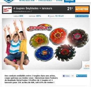 Une offre qui parait etre interessante si vous etes en train de preparer vos achats pour noel : le lot de 4 toupies beyblades metal fusion avec leur lanceur pour 27 euros port inclu ..