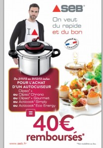Si vous avez besoin d’une nouvelle cocotte minute ou autocuiseur c’est la meme chose, une offre de remboursement interessante de la part du specialiste dans le domaine à savoir Seb : 40 euros de remboursement pour un achat d’ici le 31 decembre 2013 pour un autocuiseur Clipso+ , Clipso Chrono, Clipso+ Gourmet, Acticook simply ou Acticook Eco Energy …