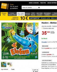 Ainsi il y a une affaire interessante sur le jeu Elefun .. Celui ci est vendu à 17.51et donc apres utilisation du code promo son prix passe à 12.51 euros port inclu .. Et quand on compare les prix on s’apercoit que ce jeu ne se vend pas à moins de 22 euros sans les frais de port ailleurs .. Et qu’il est même à 36 euros sur le site de la fnac ..
