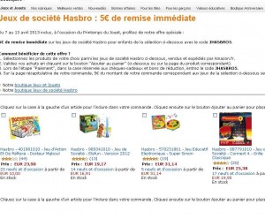 Encore une offre jouet qui peut valoir le coup : Sur amazon, jusqu’au 13 avril 2013 il y a 5 euros de remise immédiate sur une selection de jeu de societé de la marque Hasbro : Elefun, Docteur Maboul , Super Simon , Connect 4 , Bourricot , battleship 2013 ..