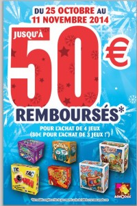 Encore un super bon plan pour acheter des jeux de société et d’ambiance de la marque Asmodee … En effet l’editeur propose 50 euros de remboursement en differée pour l’achat de 4 de ses jeux d’ici le 11 novembre 2014 ….