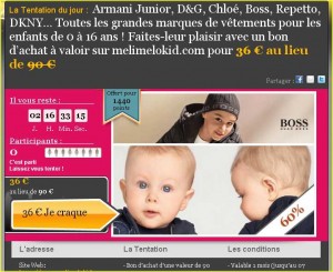 jusqu’au 6 janvier vous pouvez acheter sur le site letrader, pour 36 euros un bon d’achat d’une valeur de 90 valable sur le site Melimelokid (http://www.melimelokid.com ) . Ce site propose toutes ces grandes marques , et vous pourrez ainsi economiser 54 euros sur vos achats ..
