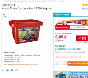 Bon plan pour un jouet pas cher et assez gros (ce qui fait toujours bien quand on offre ) plutot pour des petits garçons : sur le site carrefour on peut acheter pour 8.85 euros livraison incluse la boite de 279 briques de Kre-transformer d’hasbro .. Un coffret gros comme une page A4 et contenant donc 279 briques de types lego pour construire differents vehicules ..
