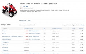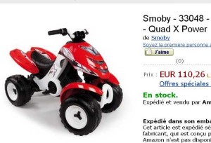 parmi les jouets concernés on peut voir un quad smoby pour enfants à partir de 3 ans .. Ce quad est donc vendu initialement 110.26 et son prix passe donc alors à 82.69 euros ..