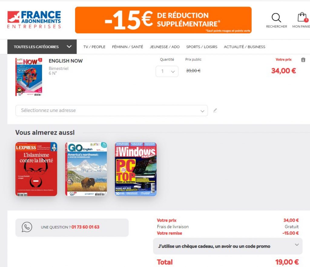 L’abonnement à ENGLISH NOW d’un an est en effet proposé à 37€ mais en utilisant le lien suivant, on activera une reduction de 15€ qui va apparaitre dans le panier d’achat … Le montant à payer ne sera donc que de 22€ seulement …