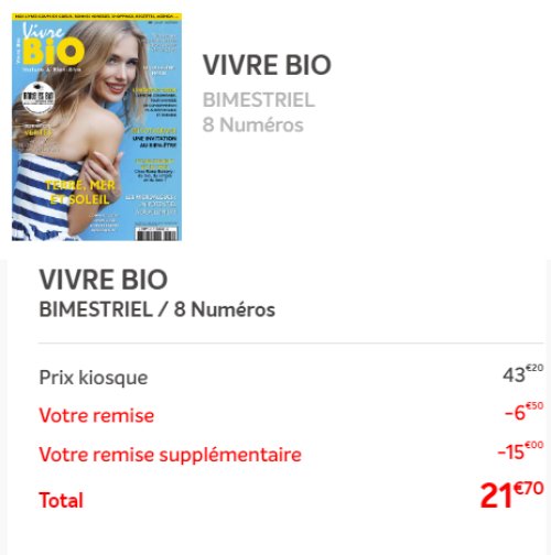 L‘abonnement d’un an à Vivre Bio pour 8 numéros est proposé à 36.7€ ( au lieu de 43€ au numéro) , mais en plus actuellement on bénéficie d’une réduction supplémentaire automatique de 15€ dans le panier d’achat
