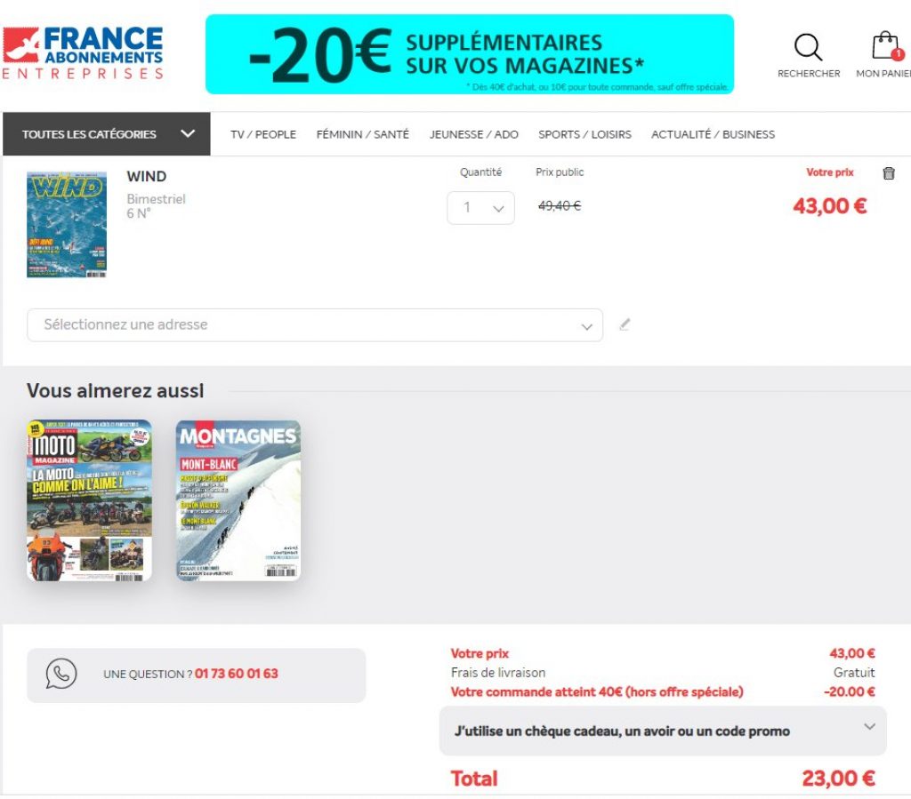 Sur le site de France Abonnement – KIOSQUE FAE, il y a une promotion qui donne 20€ de remise pour une commande d’au moins 40€ ..