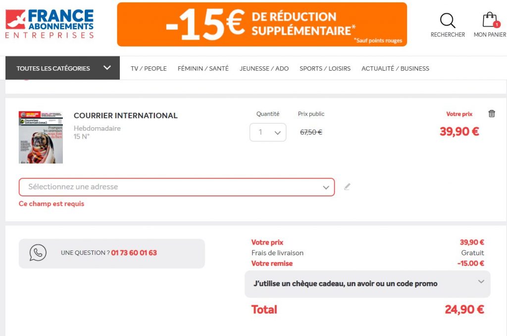 Sur le site de France Abonnement, il y a une promotion qui donne 15€ de remise immediate supplementaire dans le panier d’achat…