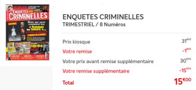 - prix final de l’abonnement au magazine Enquêtes criminelles : 23.4€ (18.4€ jusqu’au 24/6
