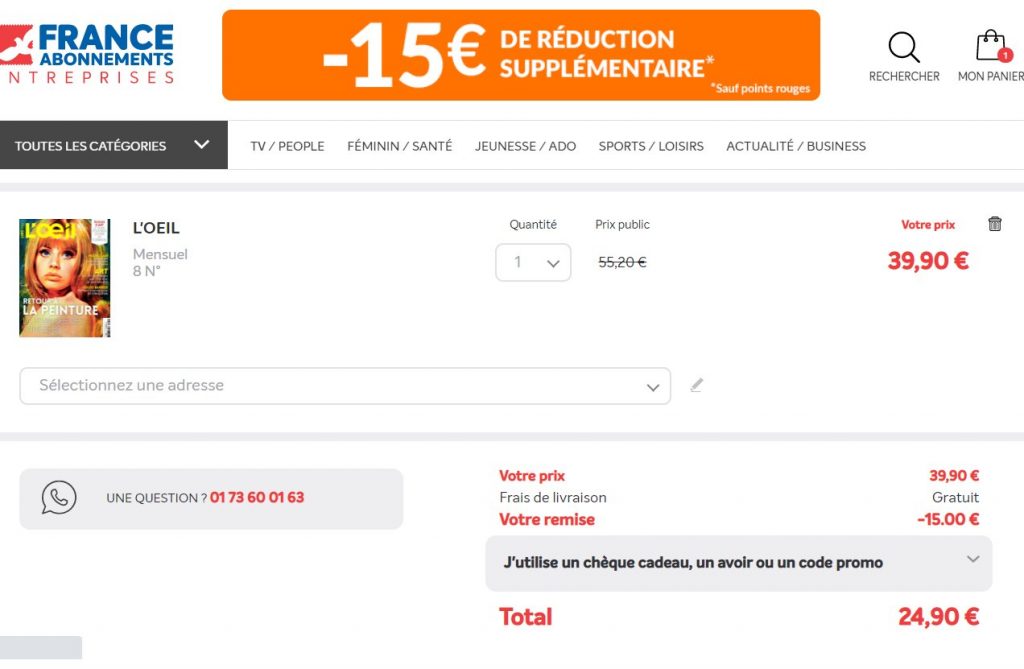 En effet sur KiosqueFae l’abonnement de 8 mois est proposé est à 39.9 € mais en plus on bénéficie d’une réduction supplementaire automatique de 15 euros qui va apparaitre automatiquement dans le panier d’achat … soit donc au final un prix de 24.9€ à payer