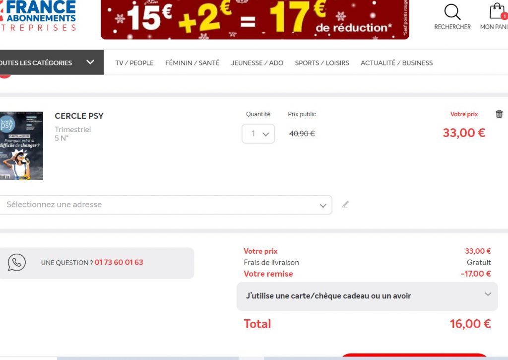 Sur Kiosque Fae ( le site de France Abonnement) , on peut voir un abonnement au magazine « LE CERCLE PSY » proposé à 33€ les 5 numeros (au lieu de 40.9€ au numero)