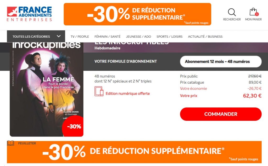 Sur le site de France Abonnement,l’abonnement est proposé à 89€ mais en plus on a une réduction supplementaire de 30% , ce qui fait que le prix à payer sera de 62€ seulement !!