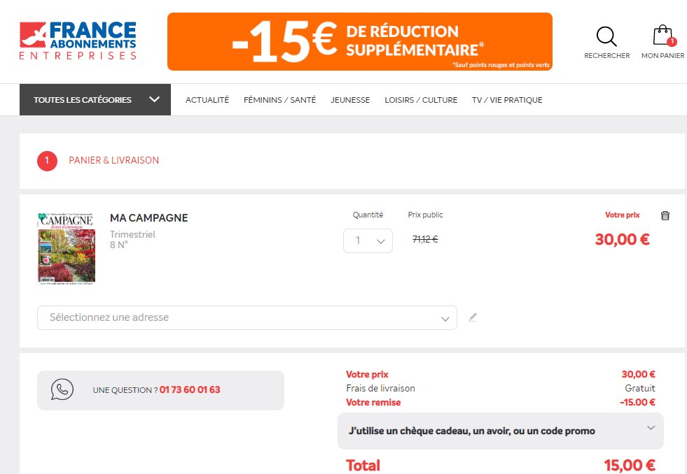 Sur Kiosque Fae , le site de France Abonnement , l’abonnement à Ma Campagne est proposé à 30€ mais en plus on a une réduction supplementaire de 15€ dans le panier de commande
