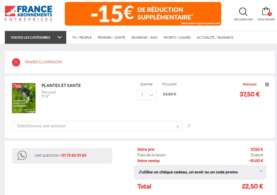 Sur le site de France Abonnement , L’abonnement d’un an à Plantes et santé est proposé à 39€ seulement actuellement – ce qui fait déjà déjà une réduction de 26€ par rapport au prix au numéro ( 35€ sur 1 an – 5.95€ le numéro ) , mais en plus il y a 15€ de réduction supplementaire dans le panier , le prix de l’abonnement à Plantes et Santé passe donc à 24€ ( Encore moins cher jusqu’au 22 avril avec 22€ de réduction et un prix d’abonnement qui passe donc à 17€ )