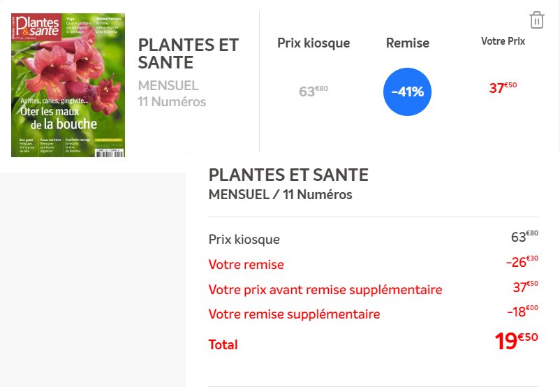 - prix final de l’abonnement à Plantes et Sante : 24€ (17€ jusqu’au 22/04 )