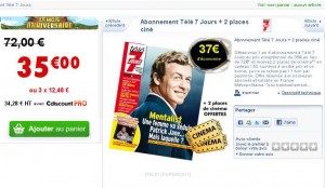 En effet , l’abonnement d’un an à Tele7 jours est à 35 euros et en prime 2 places de cinéma valables dans les cine gaumont et pathé sont offertes ..