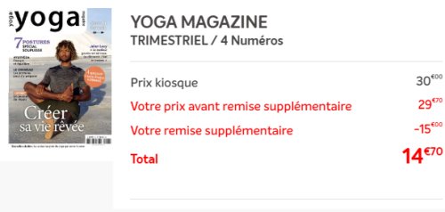 Sur FranceAbonnement l’abonnement à YOGAMAGAZINE est proposé à 29.7€ .. mini réduction de 0.3€