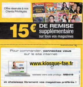 Très bon plan pour s’abonner à des magazines en tout genre : En effet avec le code MB419 on obtient 15€ de remise immédiate sur le site de france abonnement www.kiosque-fae.fr sur tous les abonnements proposés (sauf ceux avec point rouge ) et ce sans minimum ..