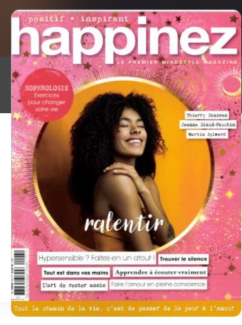 Le magazine Happinez est un magazine de développement personnel qui mêle bien-être, spiritualité et art de vivre. D’origine néerlandaise, il s’adresse à ceux qui recherchent l’inspiration pour une vie plus sereine et épanouie. Chaque numéro propose des articles sur la pleine conscience, la psychologie positive, la philosophie, la méditation et les traditions spirituelles du monde.