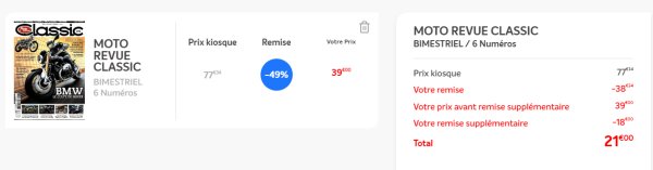Sur FranceAbonnement , l’abonnement d’un an à MotoRevue Classic est proposé à 39€ .. cela fait déjà une petite reduction par rapport au prix au numero
