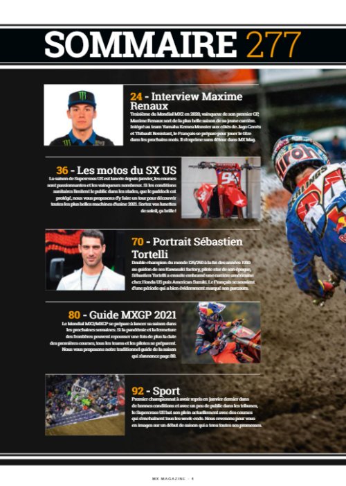 Pour les passionnés de motocross, supercross et freestyle , il existe un magazine dédié , c’est MX MAGAZINE de l’éditeur qui propose de nombreuses revues moto que Moto Magazine , Moto Revue notamment …