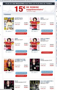 Toujours de bonnes affaires sur france abonnement pour s’abonner pour vraiment pas cher à des magazines féminins : avec le code promo « PB053 » on a 15 euros de remise immediate ce qui fait que le prix à payer pour de nombreux abonnements est vraiment faible : 24 numeros du mensuel Glamour à 24 euros passent donc à 9 euros, 12 numeros (1an ) de marie claire pour 6 euros , 20 numeros de jalouse pour 7.71 euros, 14 numéros de marie france pour 7 euros , 18 numéros de questions de femmes pour 6 euros , 7 euros les 14 numeros de marie claire …