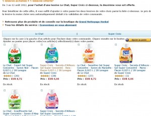 Une offre lessive qui parait interessante chez amazon : jusqu’au 12 aout, plusieurs bidons de lessives liquides des marques super croix et le chat font l’objet d’une offre 1 achete = 1 offert ..