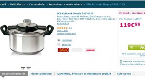 Si vous avez besoin d’une cocotte minute (ou autocuiseur) , peut etre une bonne affaire du coté du site mistergooddeal : en effet dans les soldes on trouve à 119.90 l’autocuiseur seb Acticook Simply P433415 .. Avec a livraison il reviendra à 125.98 … Interessant déjà quand on voit qu’amazon vend cette même cocotte minute à 155 euros ..