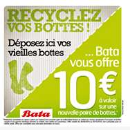 les magasins bata proposent une offre interessante pour qui à prevu d’acheter une nouvelle paire de bottes : En effet , echange d’une vieille paire de bottes (excepté bottes plastiques) , le magasin donnera un bon d’achat de 10 euros valable pour l’achat d’une nouvelle paire.