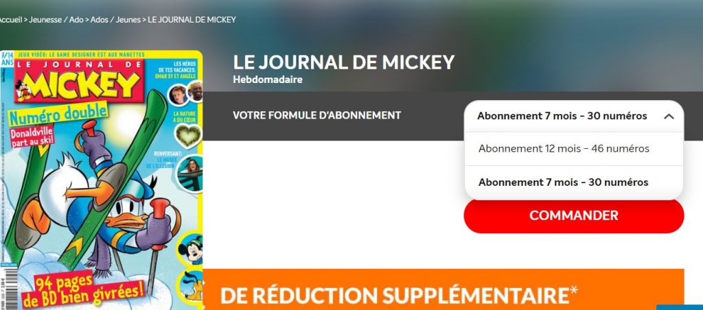 C’est le meilleur bon plan et le tarif le plus bas pour prendre un abonnement d’un an au JOURNAL DE MICKEY : on peut comparer les prix avec : la boutique disneymagazine ( 114€ pour 52 numéros (prix de revient de 2.19€ au numéro) ) , Jemabonne (79€ pour 34 numéros soit donc 2.32€ au numéro ) , Viapresse ( 144€ 52 numéros + 8 numéros picsou )