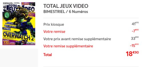 chez FRANCE ABONNEMENT , l’abonnement d’un an à Total Jeux Video est proposé à 18.9€ seulement .. On a donc une réduction de pres de 40%