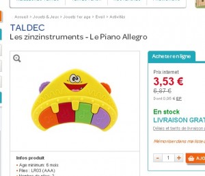 Il y a d’autres jouets musicaux taldec pas chers sur carrefour online : le tam tam ramdam à 3.83 euros et le trio barjot à 6.89 euros Voir ces jouets musicaux