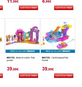 On peut voir les boites Polly Pocket Mode en Scene et Yatch Tropical à 39.99 euros chacune … Mais en plus on peut utiliser le code de reduction « CADEAUX10 » qui donne 10 pourcent de remise ..