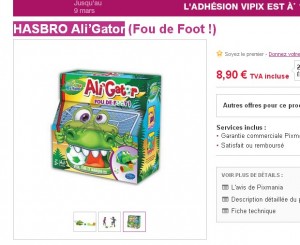 Encore une bonne affaire jouet sur pixmania : on peut voir le jeu hasbro Ali Gator à 8.90 euros livraison incluse en point relais ..