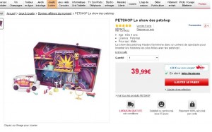 Encore une bonne affaire en prevision de noel pour un jouet sur auchan.Fr … On peut voir la boite « le show des petshops » à 39.99 mais avec 24 euros de credit sur la carte ..