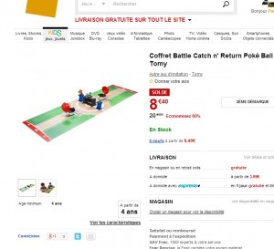 Encore un jouet pas cher : 8.4 euros la boite Battle Catch n’ Return Poké Ball Tomy … Un jeu plutot pour les garçons puisqu’il s’agit d’un jeu en rapport avec les pokemon … les Poké Balls à rétro friction sont l’élément principal. Place les figurines au centre du tapis de jeu fourni et entre dans une bataille farouche pour devenir le meilleur dresseur de Pokémon. Chaque coffret contient 2 Poké Balls à rétro friction, 3 figurines et 1 tapis de jeu. Chaque figurine est accompagnée de sa fiche d’identité présentant ses caractéristiques principales. La fiche d’identité est compatible avec le Pokédex vendu séparemment. ( description sur amazon)