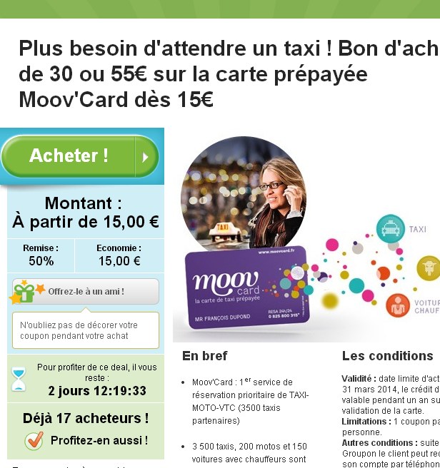 Bonne affaire pour économiser sur une ou plusieurs courses en taxi : En effet on peut acheter une carte « moov card », carte de paiement prépayée pour régler ses courses en taxis , à un prix reduit sur groupon .. Ainsi la carte avec 30 euros est vendue à 15 euros, et celle avec 55 euros est vendue 25 euros ..