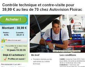 Pour les bordelais, si vous avez besoin d’ici le mois de juin d’effectuer le controle technique à votre véhicule , bonne affaire sur groupon : pour 39.9 euros on peut acheter un bon donnant droit au controle technique + l’eventuel contre visite dans un centre agréé de Floirac..
