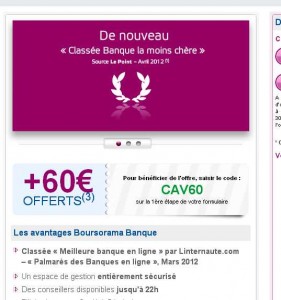 60 euros de prime c’est donc très interessant, surtout que chez boursorama la plupart des services sont gratuits ( tenue de compte, virement externe , les envois de chequiers, les cheques de banque, la carte bancaire …)