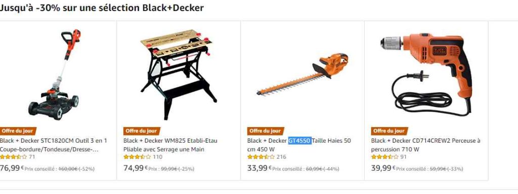 Avec sur amazon, une offre qui annonce jusqu’à 30% de réduction sur une petite selection de produits ..Taille haie, coupe bordure – tondeuse , etabli , perceuse à percussion..