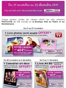 Mais il y a actuellement une autre offre interessante , c’est que chaque semaine du 21/11 au 25 decembre, un cadeau photocite est offert pour toute commande de plus de 40 euros sur le site de la boutique du timbre
