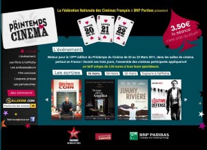 Pour les cinephiles économes l’operation « le printemps du cinema » se deroulant du 20 au 22 mars 2011 n’est pas à manquer : en effet , dans tous les cinémas participants, pour toutes les séances et tous les films le prix de la place sera de 3 euros 50, soit moins de la moitié du prix généralement appliqué pour un place en temps normal.