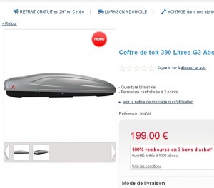 onne affaire pour un coffre de toit pour voiture : sur norauto on peut voir donc un coffre de toit 390 litres à 199 euros mais entièrement remboursé sous forme de 3 bons d’achats de 66 euros …