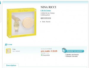 Encore une affaire intéressante dans la parfumerie en ligne douglas : cette fois ci c’est sur le coffret l’Air du Temps de Nina Ricci : Ce coffret contient l’eau de toilette en 30ml ainsi qu’un savon et revient donc port inclu à 30.90 euros ..