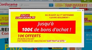 Sur le site conforama jusqu’au 1er septembre il y a une offre 10 euros en bon d’achat offert par tranche de 100 d’achats … Une offre valable sur l’ensemble du site …
