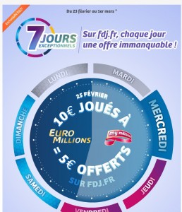 le 25 fevrier par exemple , c’est 10 euros joués à euromillions qui donnent droit à un bonus de 5 euros
