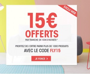 Le code de réduction « FLY15 » donne 15 euros de remise par tranche de 100 euros d’achat sur la boutique en ligne Fly .. Donc si vous aimez les meubles et articles de décoration vendus chez fly , cela peut vous interesser ..
