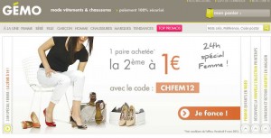 Offre pour la journée de la femme avec un jour de retard chez Gemo : Le 9 mars, Gemo propose la deuxieme paire de chaussure à 1 euro … Comme d’habitude avec ce type d’offre, la paire à 1 euro est la moins chere des deux , il faut donc dans la mesure du possible prendre 2 paires ayant le meme prix , ou des prix tres proches pour optimiser au mieux la promo ..