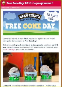 Le 12 avril , les glaciers Ben & Jerry renouvellent leur opération promotionnelle  Glace Gratuite « Free cone day » dans 10 de leurs boutiques de France (à Paris , Lyon , Bordeaux , Strasbourg , Honfleur , Bagnoles de l’orne )  .